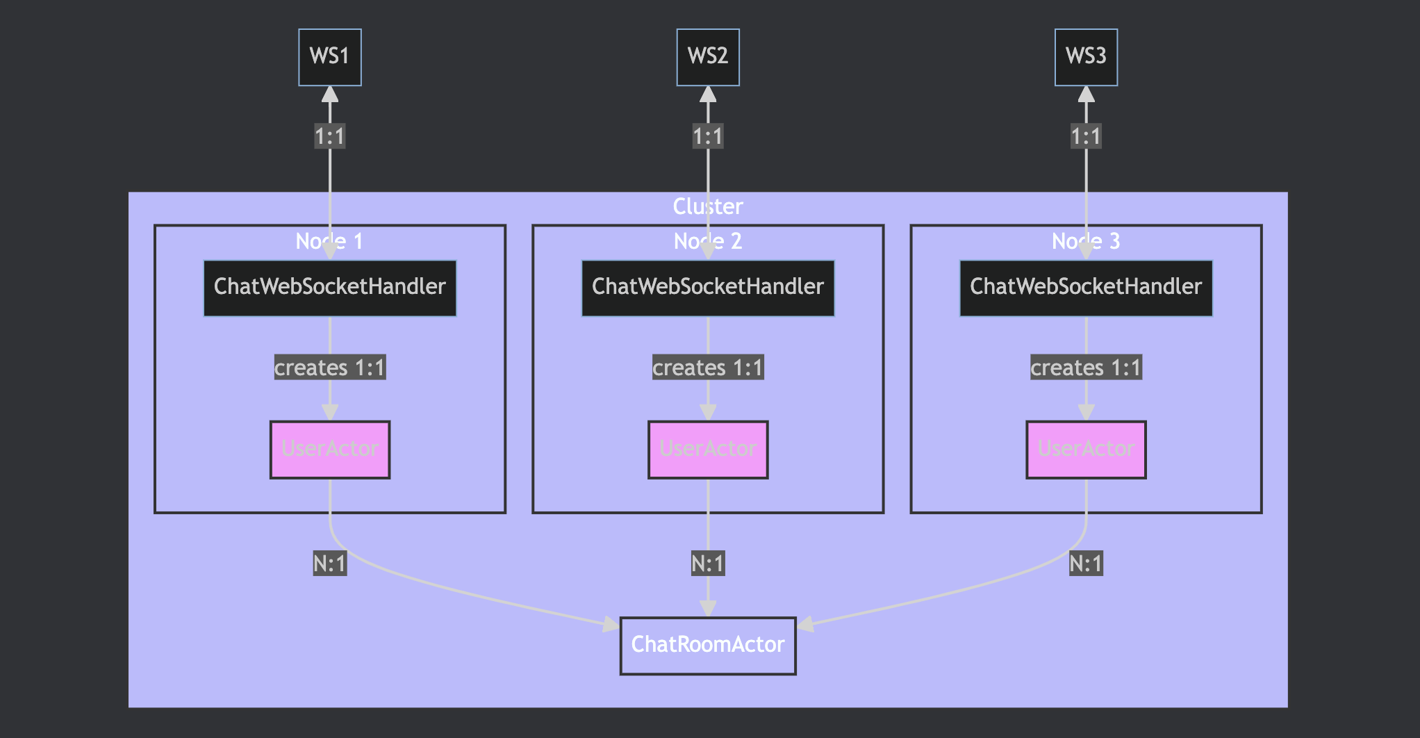ChatWebSocketHandler 구현에 앞서 채팅 시스템의 아키텍처를 우선 생각해 보겠습니다. 유저가 웹소켓 커넥션을 생성하면 해당 커넥션을 담당하는 액터를 생성할 건데 해당 액터를 UserActor라고 명명하겠습니다. 그리고 특정 채팅방에서 발생하는 모든 이벤트를 처리하는 액터를 ChatRoomActor라고 명명하면 전체적인 아키텍처는 아래와 같습니다.