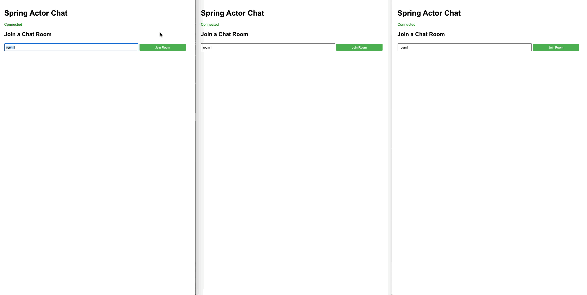 위 스크립트 파일명을 cluster-start.sh로 작성하면 "sh cluster-start.sh 8080 2551 3" 커맨드로 3개의 서버를 지닌 클러스터를 실행할 수 있습니다. 그럼 브라우저 3개를 띄우고 각각 localhost:8080, localhost:8081, localhost:8082를 접속하면 채팅 기능이 정상 동작하는 것을 확인할 수 있습니다.