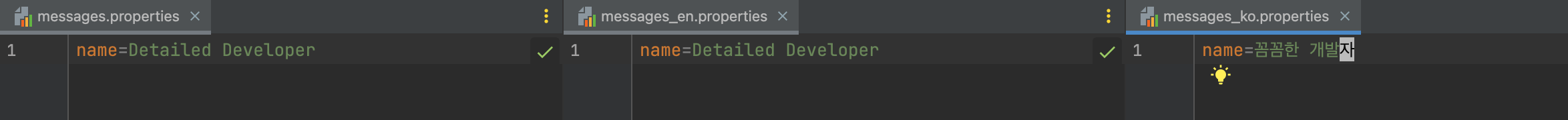 각 파일은 messages로 시작하고 접미사로 각 국가 코드를 사용함으로써 java의 Locale 설정과 연동할 수 있습니다(물론 Spring 설정을 통해 messages 파일명과 파일 위치를 바꿀 수 있습니다). 예를 들면 messages_ko.properties 파일은 MessageSource의 Locale설정이 Locale.KOREAN으로 설정됐을 때 사용됩니다. 아무런 접미사가 없는 messages.properties 파일은 Spring의 MessageSource가 매칭되는 Locale 설정을 찾을 수 없을 때 사용하는 파일입니다. 각 파일에는 사용하고자 하는 message를 key=value 형태로 기입합니다.