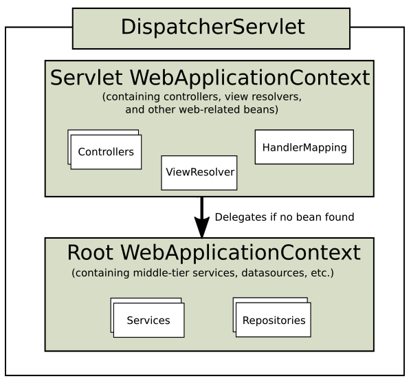 Spring의 ApplicationContext는 ParentContext와 ChildContext의 개념을 통해서 bean을 재활용하는 기능을 제공합니다. 만약 ChildContext에서 찾고자 하는 bean이 없다면 ParentContext에서 bean을 탐색합니다. 가장 대표적인 활용의 예시로는 Spring MVC의 DispatcherServlet의 WebApplicationContext입니다. ParentContext로 Root WebApplicationContext가 존재하며, Servlet의 WebApplicationContext는 각자 필요한 Bean을 등록해서 사용하고 Servlet(s)이 공통으로 사용하는 Bean은 Root WebApplicationContext에서 가져와 사용합니다.