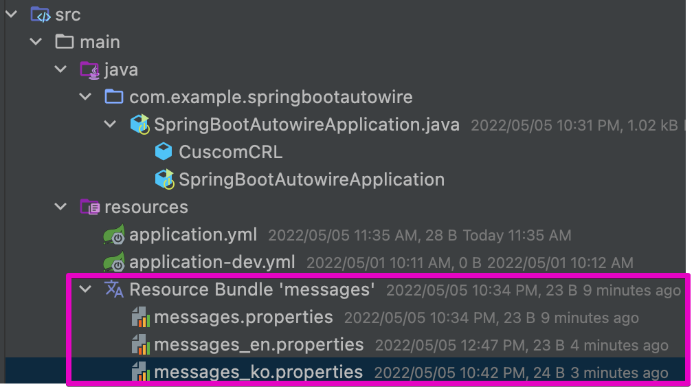 Spring MessageSource를 사용하기 위한 기본 설정은 다음과 같습니다. messages 접두사로 시작하는 파일을 resources 디렉터리 아래에 생성합니다.
