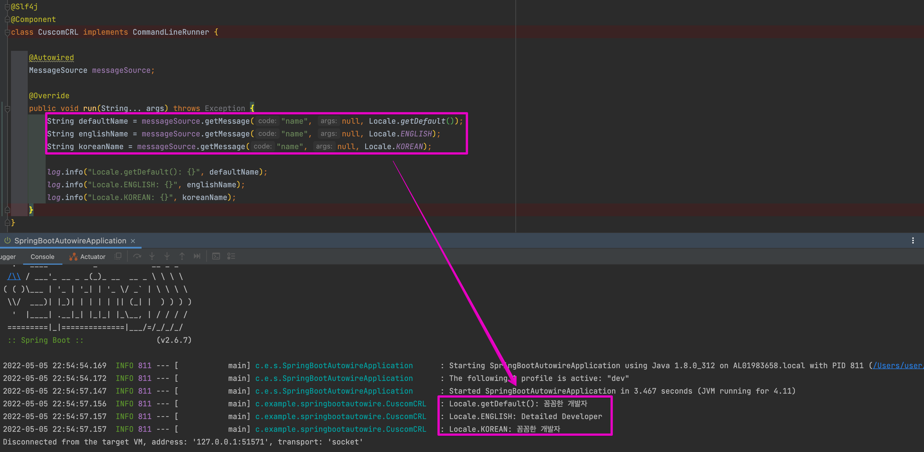 각각의 name이 Locale 설정에 따라 어떻게 출력되는지 확인해보겠습니다. Locale.getDefault()는 JVM host의 Locale값을 사용하는데, 현재 제 JVM은 Locale.KOREA로 설정이 돼있기 때문에 messages_ko.properties를 사용하는 것을 확인할 수 있습니다.