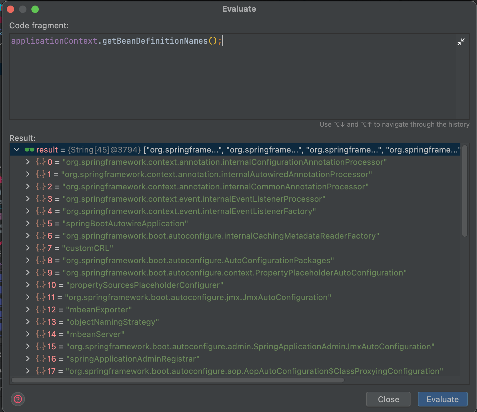 - getBeanNamesForType(Class<?> type): 등록된 bean들 중 인자로 전달된 타입인 bean들을 String[] 형태로 반환합니다.