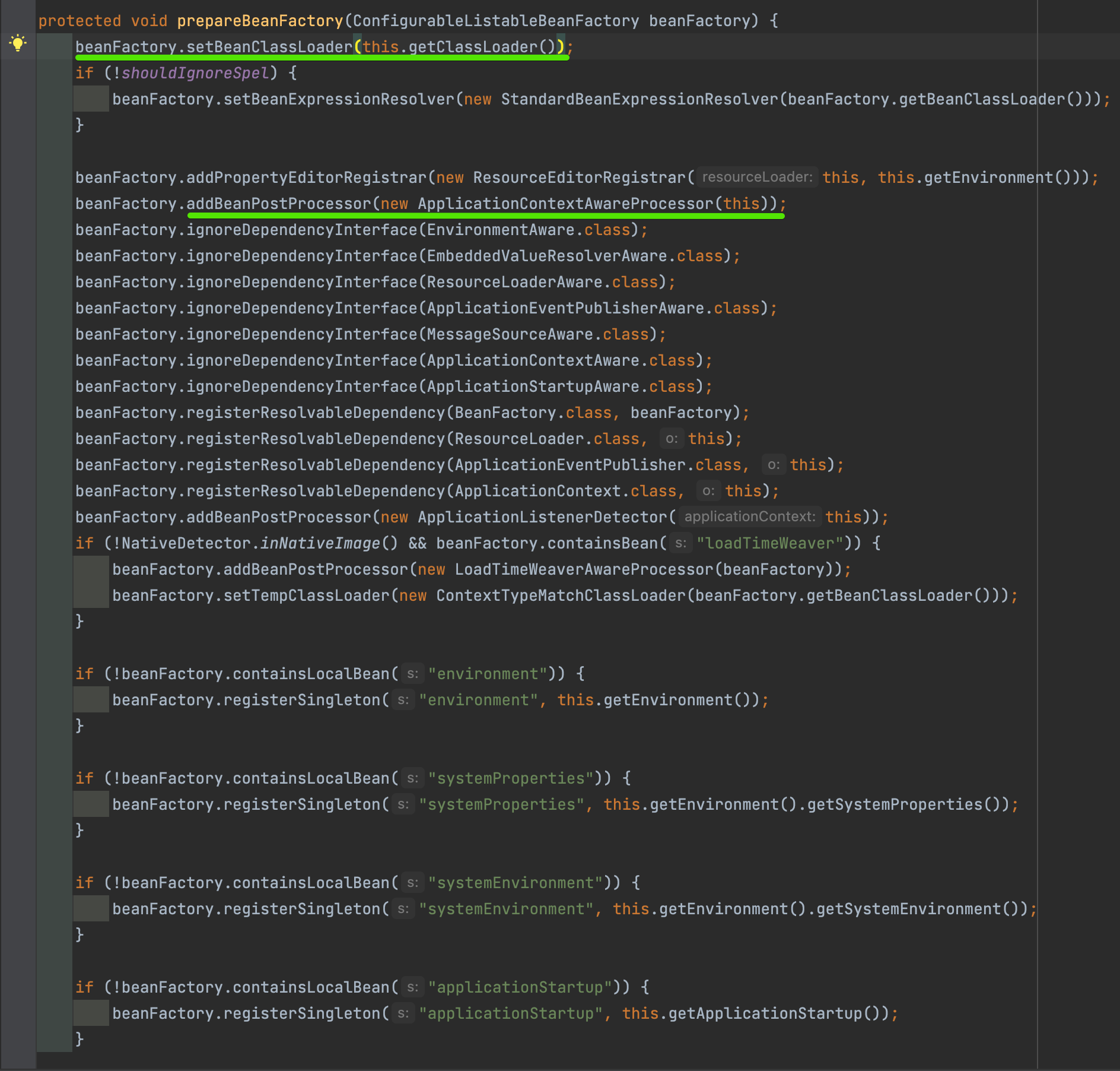 이전 코드에서 가져온 BeanFactor에 ClassLoader 또는 post-processor를 등록합니다.