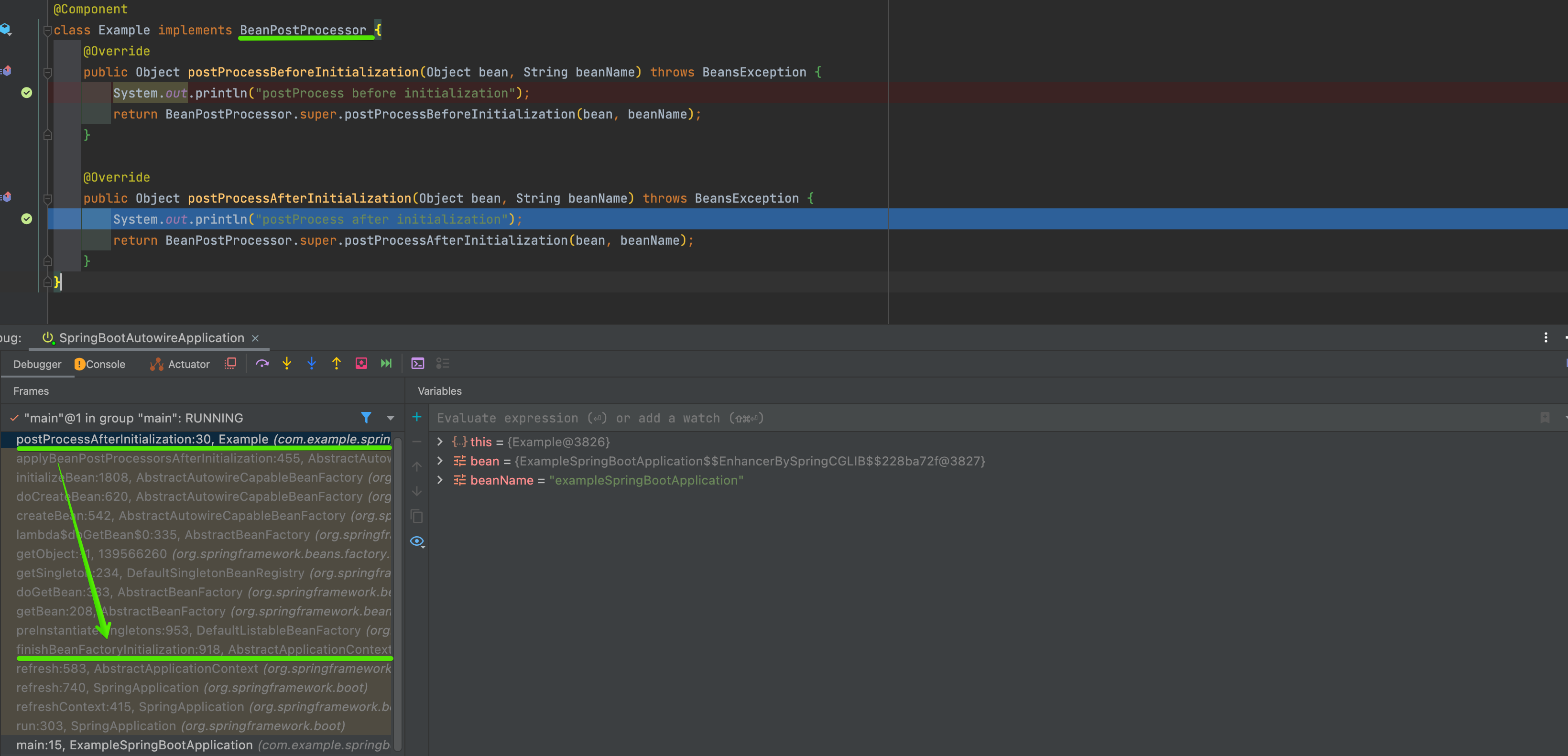 ApplicationContext의 beanFactory 초기화 단계를 마무리합니다. 남은 singleton bean을 모두 초기화합니다. 또한 BeanPostProcessor으로 등록된 bean의 postProcessBeforeInitialization, postProcessAfterInitialization 메서드를 호출하는 단계입니다.