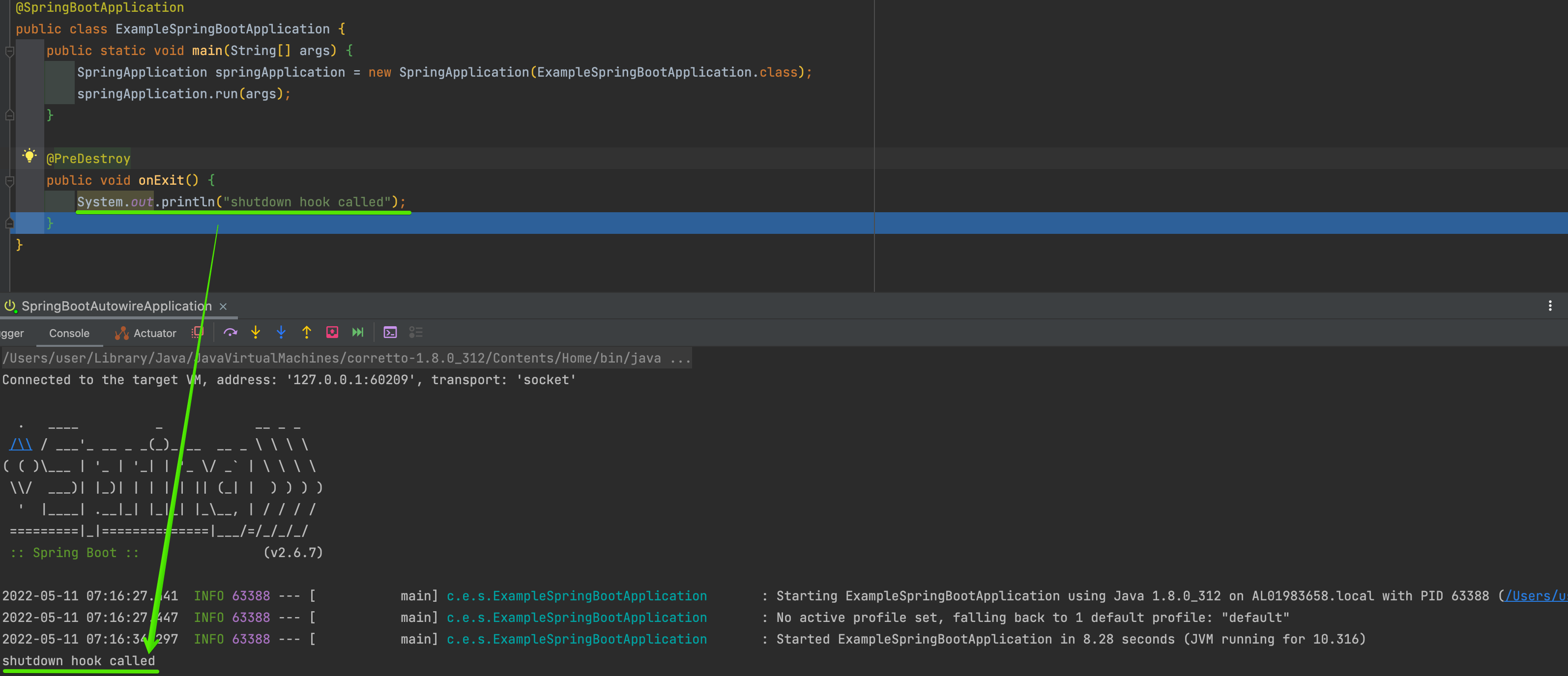 Spring은 프로그램이 종료될 때 ApplicationContext가 gracefully shutdown 될 수 있도록 관련된 함수를 호출합니다. Spring Boot는 다음과 같이 @Predestroy 어노테이션을 통해 shutdownHook을 등록할 수 있습니다.