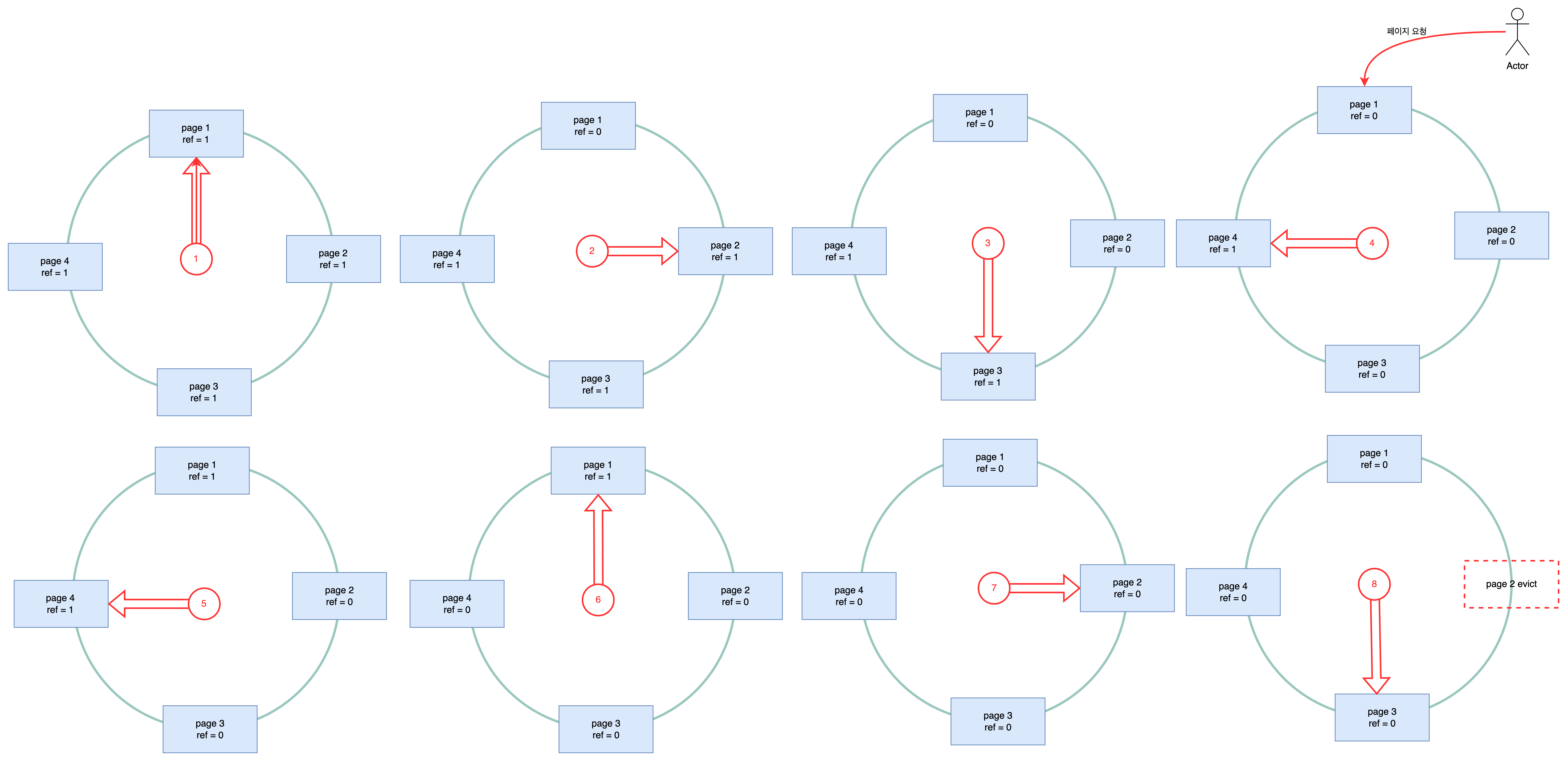 버퍼 풀에 로드된 각 페이지는 reference bit을 가지고 있습니다. 각 reference bit은 페이지 접근 요청이 있을 때 1로 설정됩니다. Clock의 "clock hand"는 주기적으로 각 페이지를 방문해서 reference bit이 1인 페이지를 reference bit을 0으로 설정합니다. 만약 reference bit이 0이라면 해당 페이지는 버퍼 풀에서 제거됩니다.