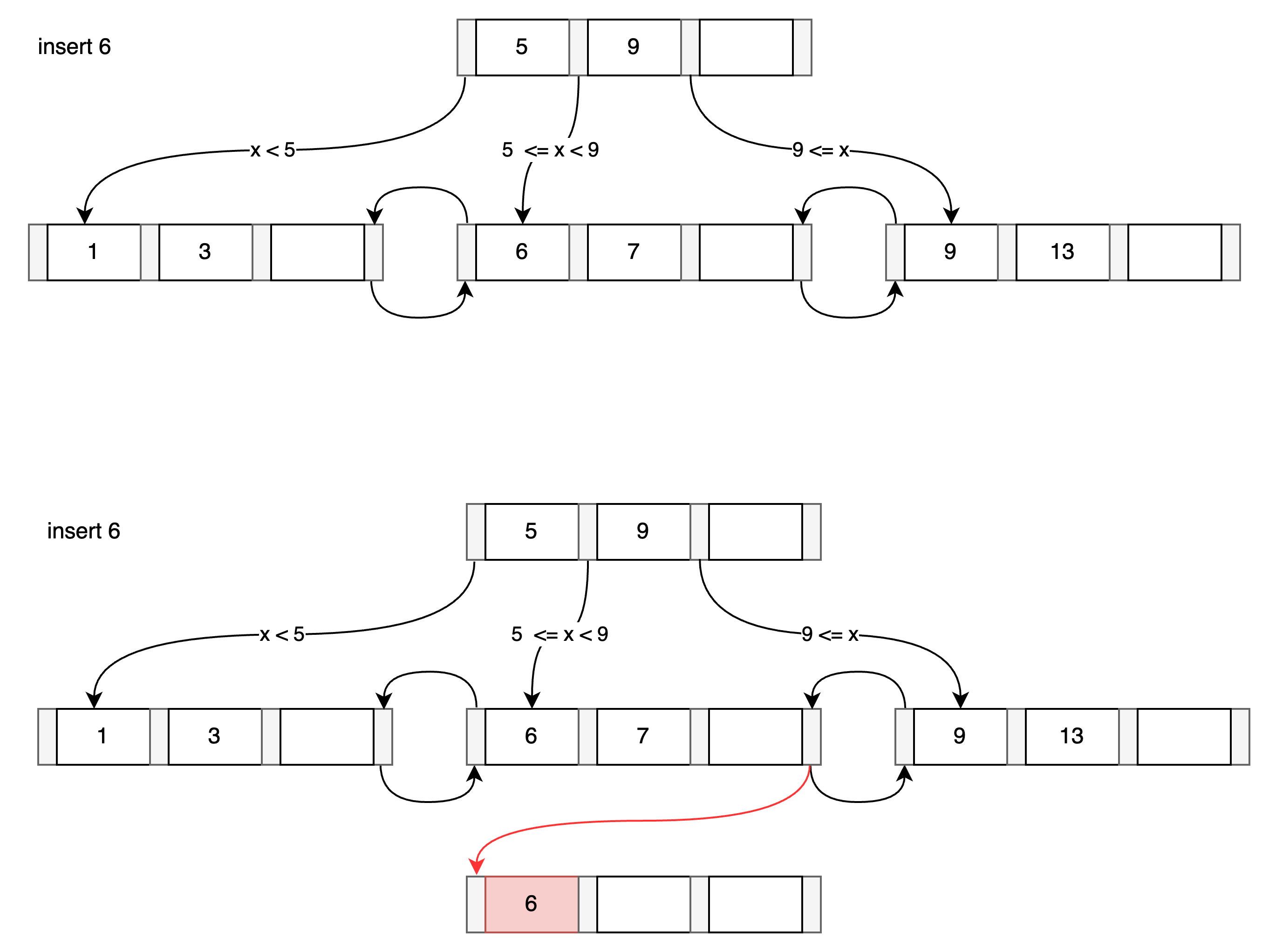 - Inner node가 k 개의 키를 저장한다고 가정하면 총 k+1 자식 노드(non-null)를 가집니다.
