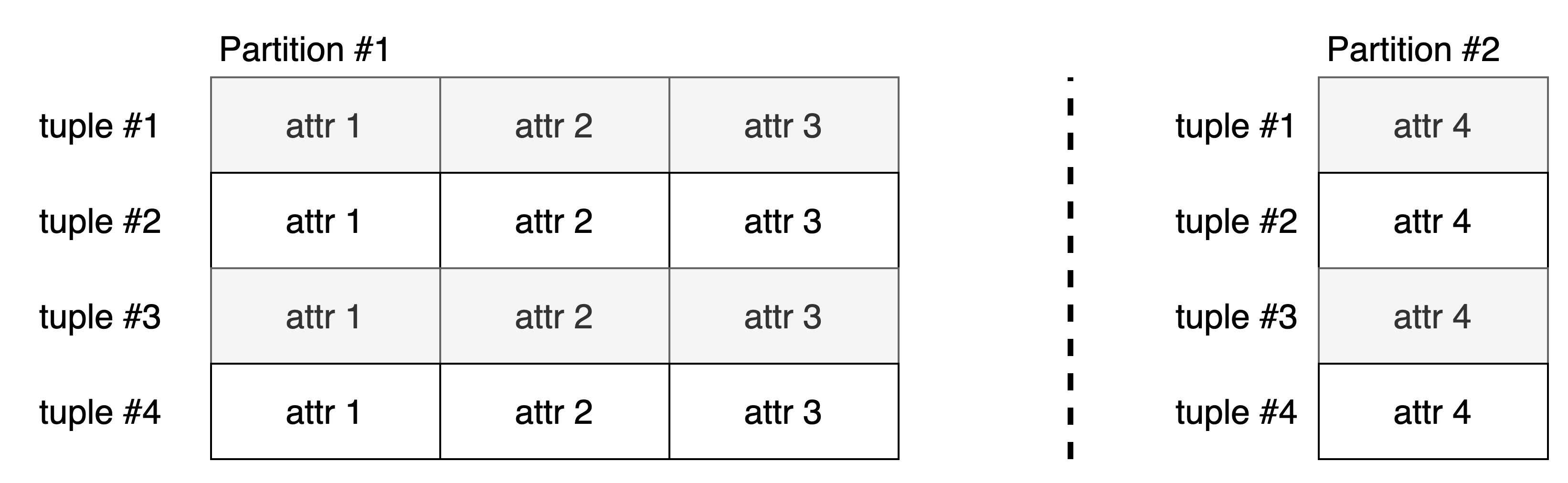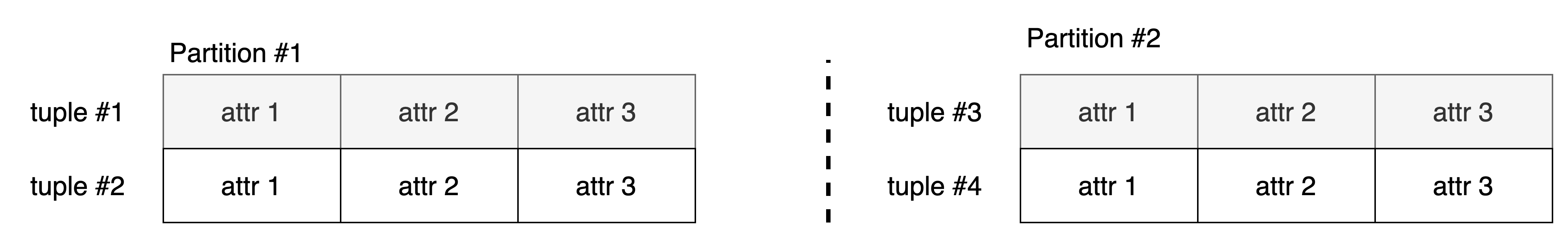하나의 테이블을 수평으로 분리하는 방식입니다. 각각의 partition은 서로 다른 위치에 저장되고 관리됩니다.