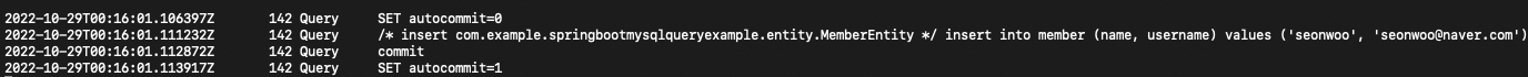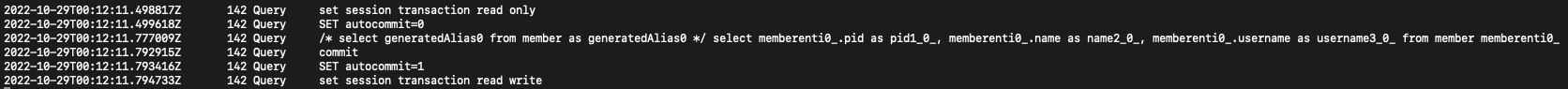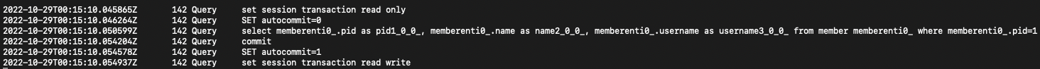 JPA에서 자동으로 설정해주는 몇 가지 특징을 살펴볼 수 있습니다. 먼저 transaction read only를 실행함으로써 해당 세션의 transaction이 read only임을 알립니다. 그다음 autocommit을 비활성화하고 요청된 쿼리문을 실행 후 직접 commit을 실행시킵니다.