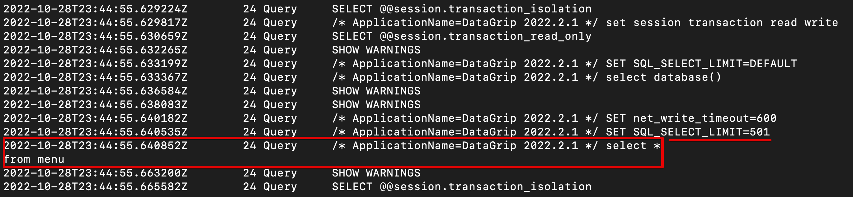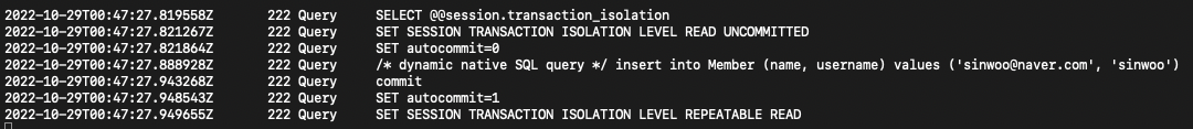 위 메서드는 isolation_level을 READ_UNCOMMITTED로 설정해서 쿼리를 실행시킵니다. 해당 메서드를 수행하면 MySql은 다음과 같은 로그가 생성됩니다.