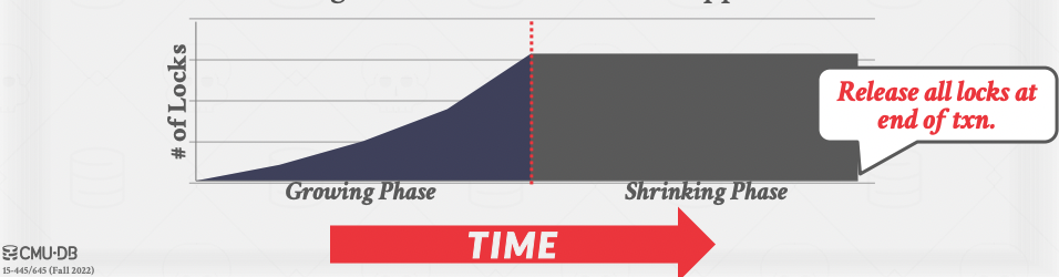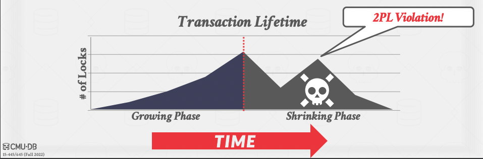 위의 그림처럼 shrinking phase에서 새로운 잠금을 획득하려 시도하는 것은 2PL 원리에 부합하지 않습니다.