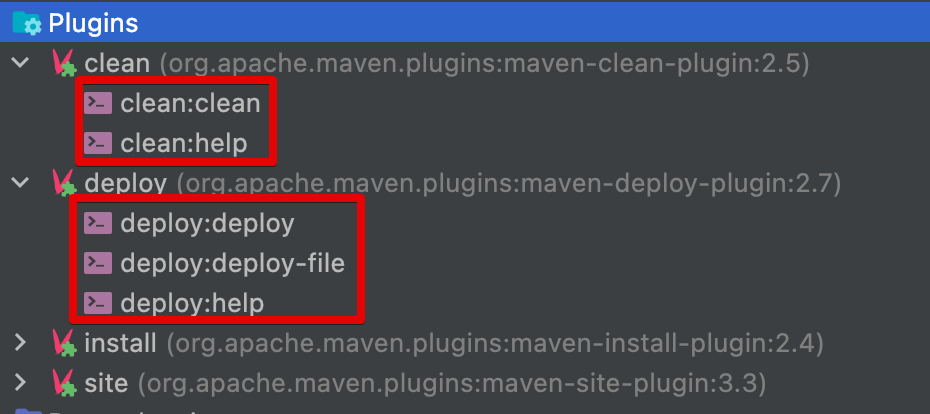 위의 그림에서 clean plugin을 통해 clean, help goal을 실행할 수 있고, deploy plugin을 통해 deploy, deply-file, help goal을 실행할 수 있습니다.