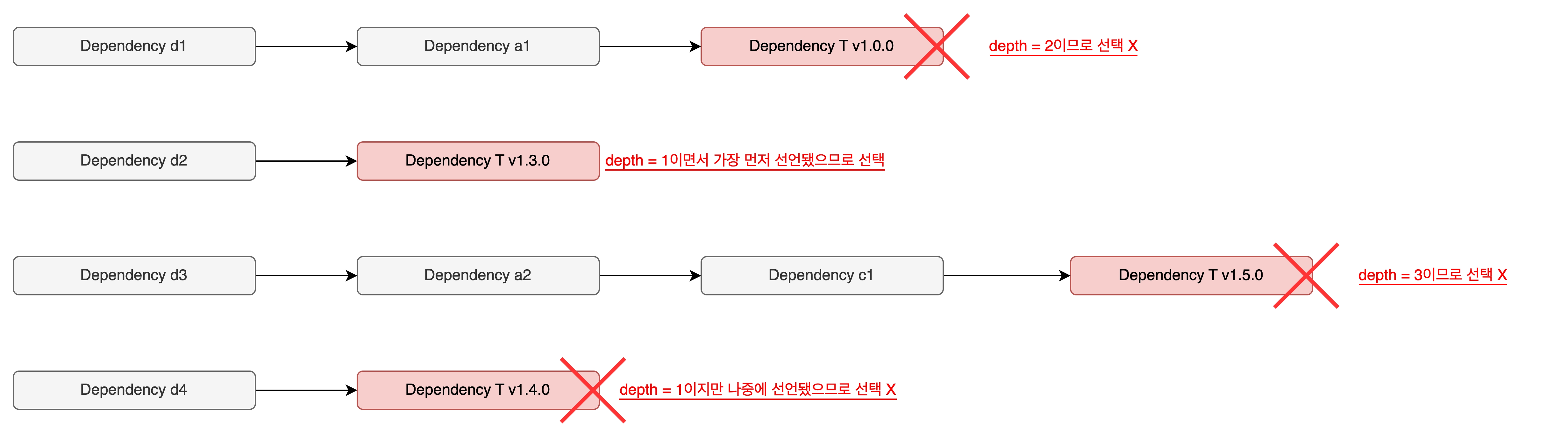 실제 사용하고자 하는 dependency를 명시하는 속성입니다. 여기서 가장 중요한 것은 해당 project에 동일한 의존성이지만 서로 다른 버전인 경우 어떻게 가져오는지 이해하는 것입니다. Maven은 중복된 의존성이 존재하는 경우 현재 POM에서 가장 가까우면서도 먼저 명시된 의존성을 가져옵니다.