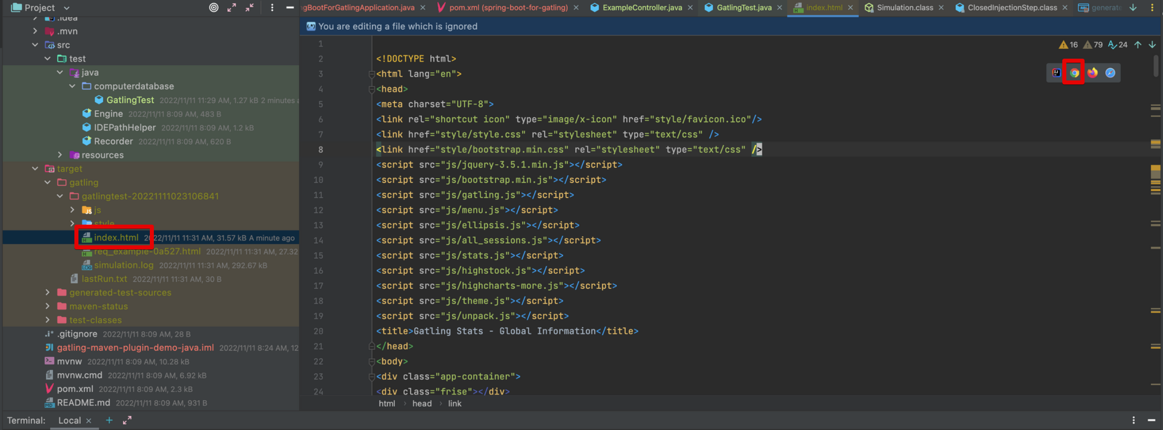해당 커맨드를 실행하면 target/gatling 디렉터리 하위에 결과 리포트가 생성됩니다.