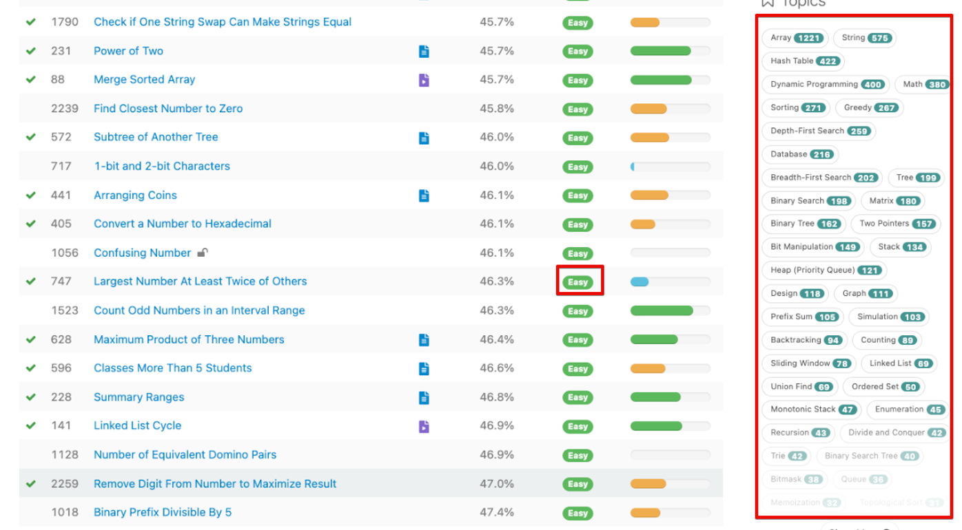 - leetcode: 전 세계의 개발자들이 취업 준비와 이직을 위해 사용하는 자료구조 및 알고리즘 학습 사이트입니다. 문제가 난이도, 유형 및 회사 별로 분류되고 주기적인 코딩 콘테스트가 있기 때문에 학습 능률이 높은 사이트입니다.