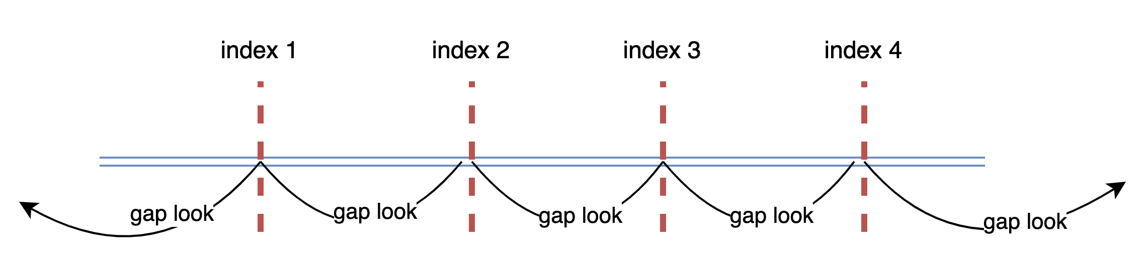 Gap locks는 인덱스 사이의 잠금입니다. 몇몇 transaction isolation level에서 일관성을 보장하기 위해서 사용합니다. Gap lock의 목적은 다른 트랜잭션이 특정 데이터를 인덱스 중간에 insert 하는 것을 방지하기 위해서 사용합니다.