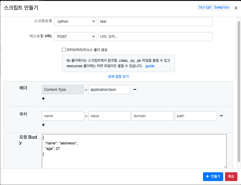 그럼 본격적으로 스크립트를 작성해보겠습니다. 스크립트 탭에서 "+ 만들기" 버튼을 클릭하면 다음과 같이 스크립트 만들기 모달이 뜹니다.