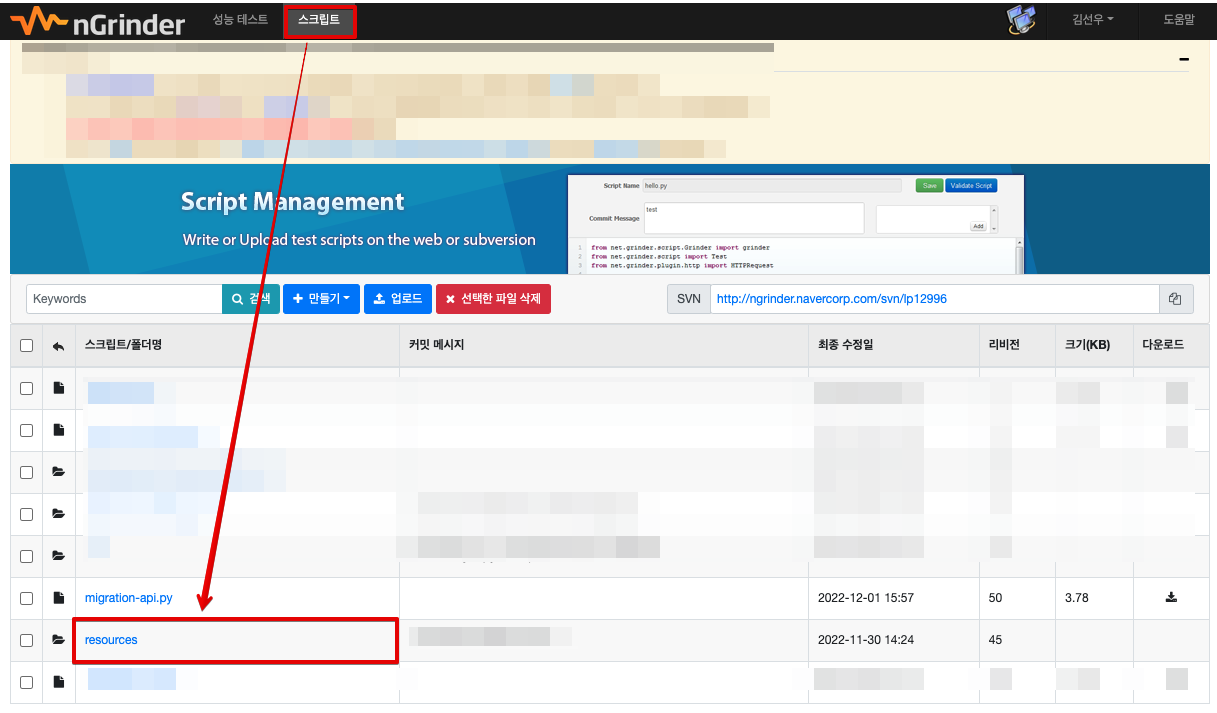 - nGrinder에 대한 기본 용어에 대해 살펴봤으니 스크립트를 작성하는 방법을 살펴보겠습니다. 저는 python과 문법이 동일하면서 java의 라이브러리를 사용할 수 있고 JVM에서 실행될 수 있는 jython을 활용해 스크립트를 작성하겠습니다. nGrinder는 스크립트에서 사용할 데이터(e.g. fixture, 더미 데이터)를 resources 폴더에 저장해서 활용합니다.