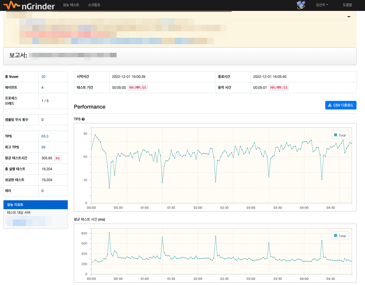 nGrinder의 테스트가 완료되면 상세 페이지에서 해당 테스트에 대한 결과를 확인할 수 있습니다. 해당 페이지에서 TPS, max TPS, 테스트 시간 등 여러 테스트 결과를 확인할 수 있습니다. 참고로 TPS와 평균 테스트 시간 그래프에서 중간중간 튀는 구간이 있는데 이는 JVM의 GC와 관련이 있다고 합니다.