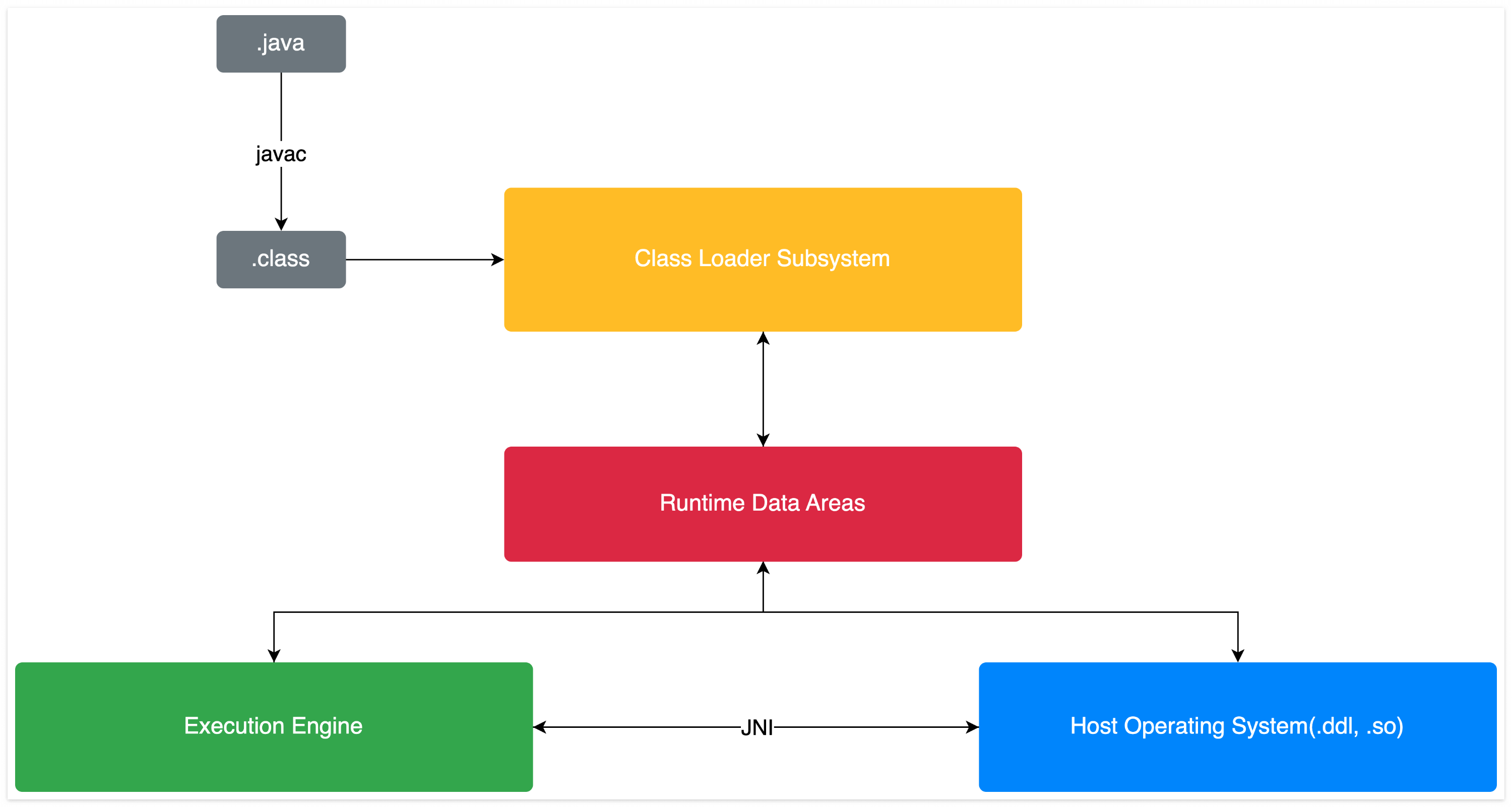 - JVM은 Java의 .class 파일이 실행될 수 있는 환경입니다. .class 파일의 bytecode를 host 운영체제 위에서 실행될 수 있는 환경을 제공합니다.