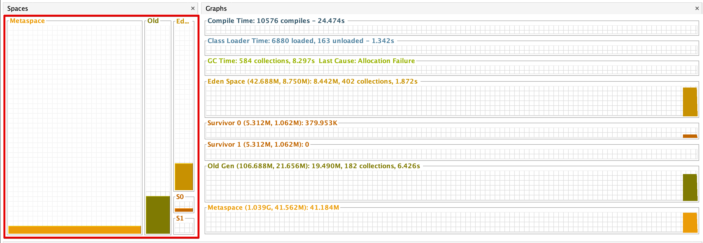 Java의 heap 영역은 young과 old 영역으로 구분됩니다. Young은 말 그대로 최근에 생성된 객체들이 위치하는 영역이고 old 영역은 특정 threshold 이상의 기간 동안 살아남은 객체가 위치하는 영역입니다. Young 영역은 또다시 eden, s0과 s1으로 구분됩니다. s0과 s1은 survivor의 약자입니다. 객체가 새로 생성될 때 해당 객체는 eden 영역에 할당됩니다. 그리고 eden 영역이 더 이상 객체를 저장할 수 없는 경우 minor gc(garbage collection)을 거쳐 s0 또는 s1의 영역으로 살아남은 객체를 이동시킵니다. 위 사진에서 보시면 s1에 저장된 객체가 없는 것을 확인할 수 있습니다. 다음 minor gc 때 eden과 s0 영역에서 살아남은 객체가 s1으로 이동하는데 이와 같은 플로우를 지니게 된 이유는 데이터 파편화(fragmentation)를 압축(compaction) 없이 해결하기 위해서입니다. 만약 s0과 s1이 동시에 사용된다면 gc에 의해 객체가 제거되면서 메모리 영역 중간중간이 비어 파편화 현상이 발생합니다. 이를 해결하기 위해서는 일정한 간격으로 압축이 필요하지만 JVM의 경우 s0 또는 s1 중 단 하나의 영역만 사용하기 때문에 별도의 압축과정이 필요하지 않습니다.