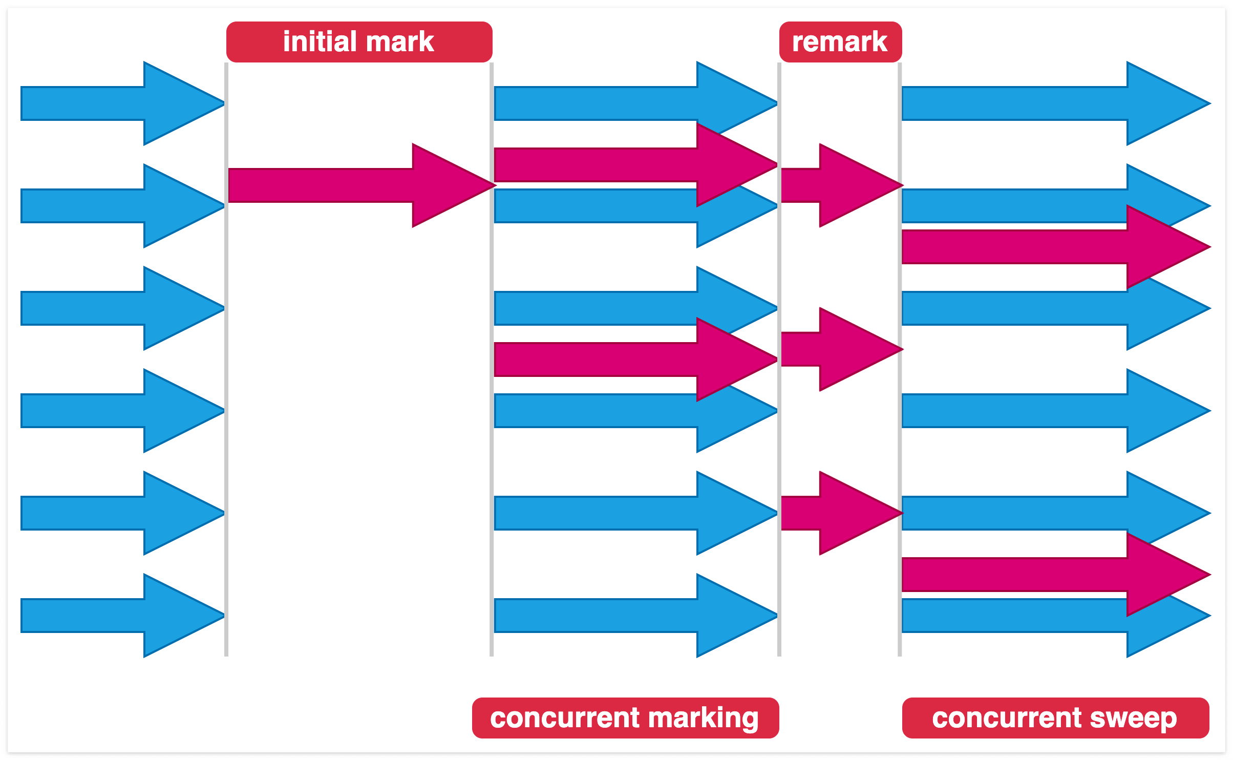 애플리케이션의 중단 없이 mark and sweep이 가능한 garbage collector입니다. 애플리케이션 중단을 최소화하기 위해 사용됩니다. 물론 CMS라고 stop the world 현상이 없지는 않습니다. Initial mark 단계와 remark 단계에서는 stop the world 현상이 발생합니다.