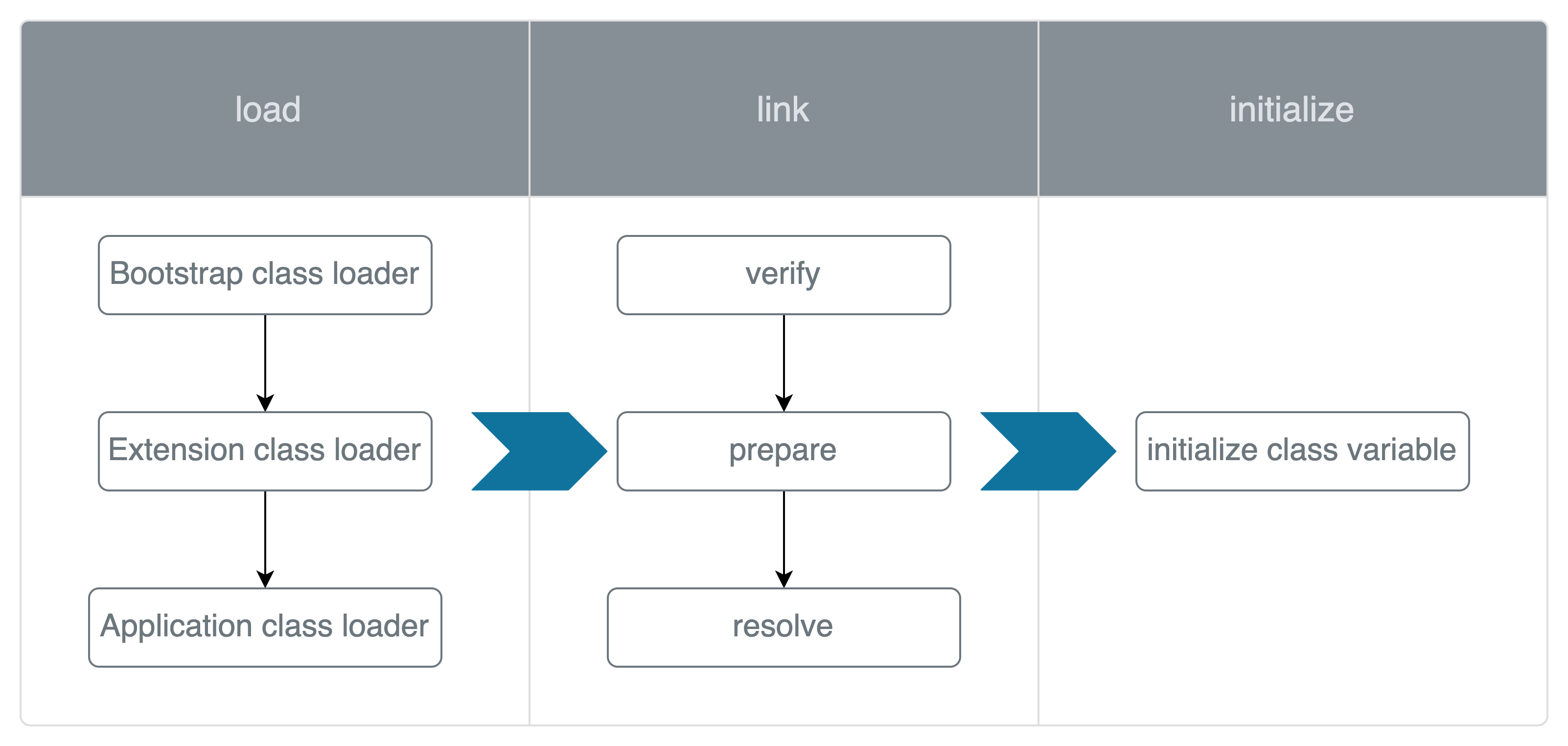 - Prepare: 클래스와 static variable을 위한 메모리를 할당합니다. 중요한 점은 static variable이 default 값으로 초기화된다는 점입니다. 예를 들어 boolean 타입의 static 변수를 true로 설정하더라도 prepare 단계에서는 해당 변수는 false로 초기화됩니다.