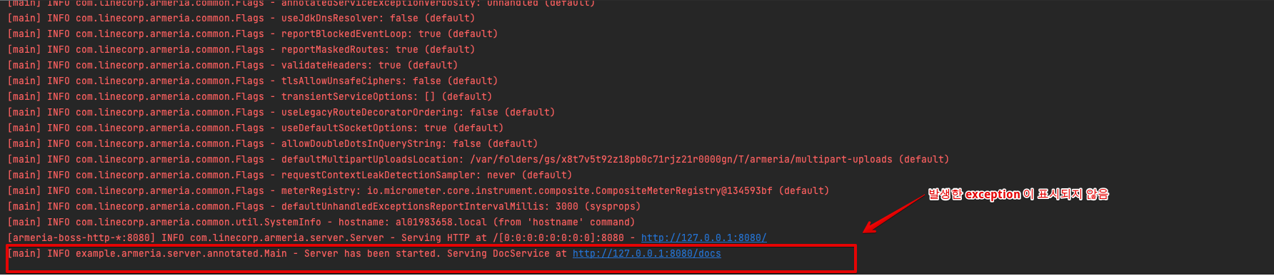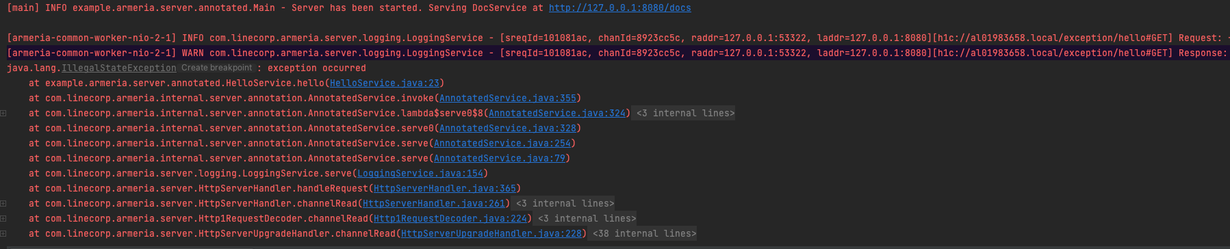 하지만 annotated service의 요청을 처리하는 과정에서 exception이 발생하는 경우 해당 exception을 로깅하기 위해서는 별도로 LoggingService를 등록해야 합니다. 만약 별도로 LoggingService를 등록하지 않으면 exception을 확인할 수 없습니다. 여기서 LoggingDecorator은 LoggingService를 decorator의 형태로 편리하게 등록할 수 있는 armeria의 기능입니다.