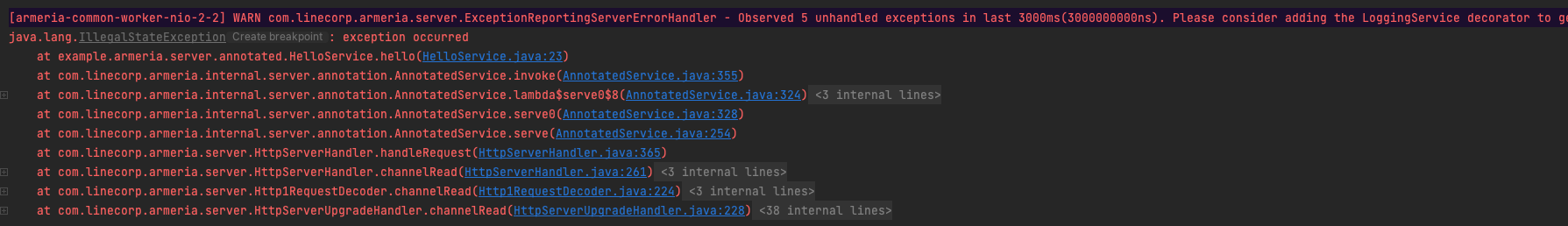 만약 유저가 LoggingService를 등록하지 않고 일정한 주기동안 발생한 exception이 따로 처리되지 않았다면 해당 exception에 대한 정보를 다음과 같이 출력합니다. 해당 기능은 JVM flag 또는 ServerBuilder를 통해서 설정할 수 있습니다.