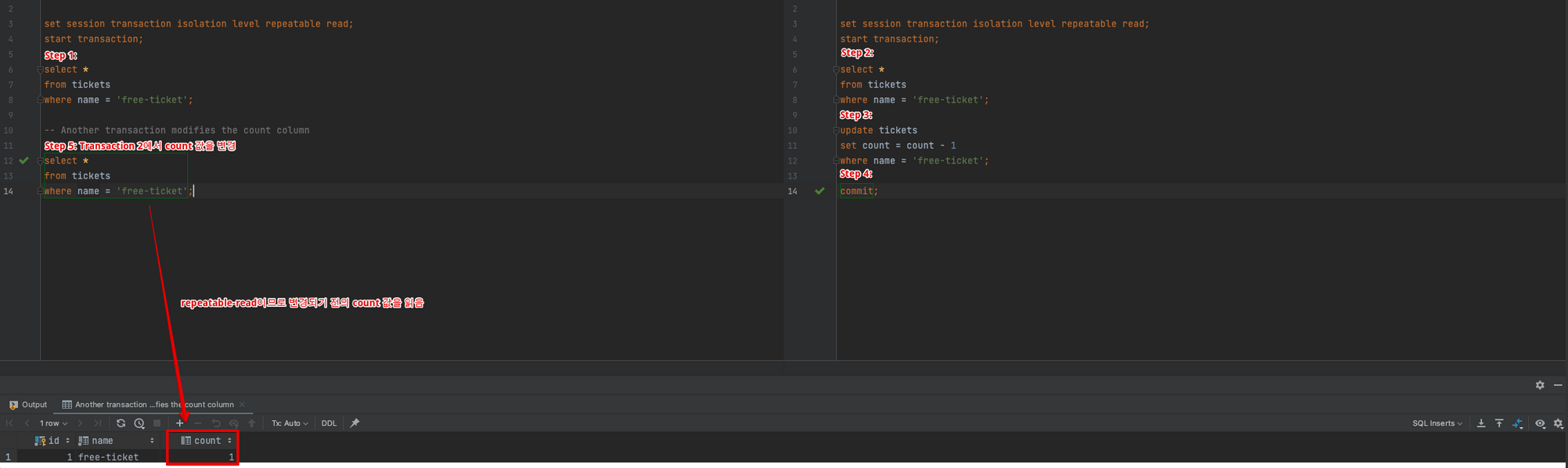 첫 번째 트랜잭션에서 티켓 수량을 확인하기 위해 다시 쿼리를 수행합니다. 티켓 수량을 update 하는 쿼리는 이미 커밋이 완료됐기 때문에 count가 0으로 수정된 것을 확인할 수 있습니다. 즉, 하나의 트랜잭션에서 동일한 SELECT 쿼리를 여러 번 수행했을 때 결과가 달라지는 non-repeatable read 현상이 발생했습니다.