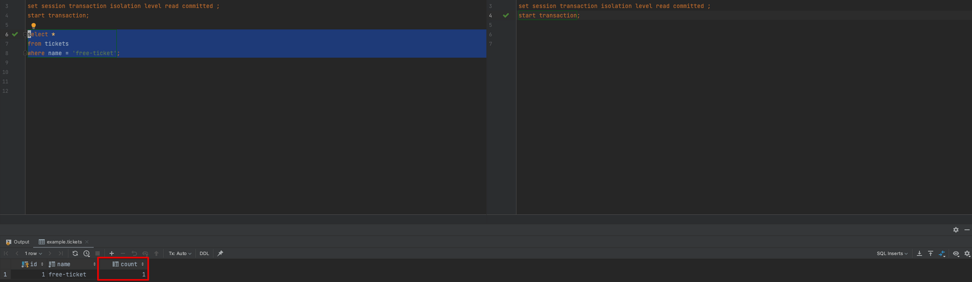 두 번째 트랜잭션에서도 사용 가능한 티켓을 조회하기 위한 쿼리를 수행합니다.