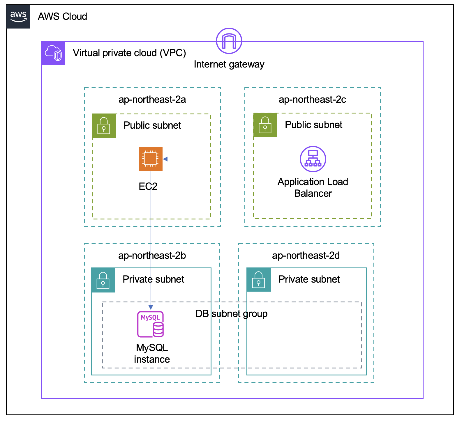- Load balancer, EC2는 public subnet에 위치