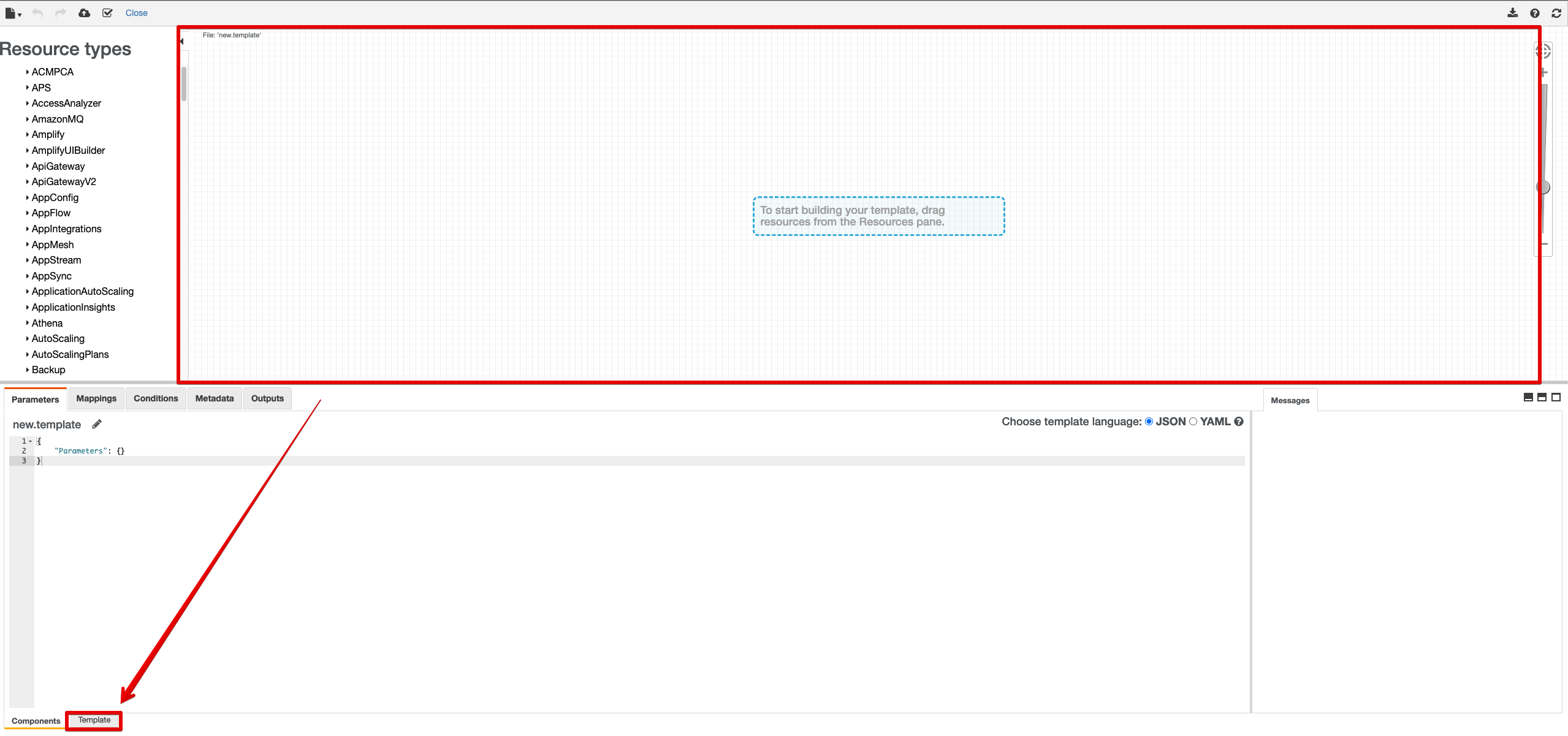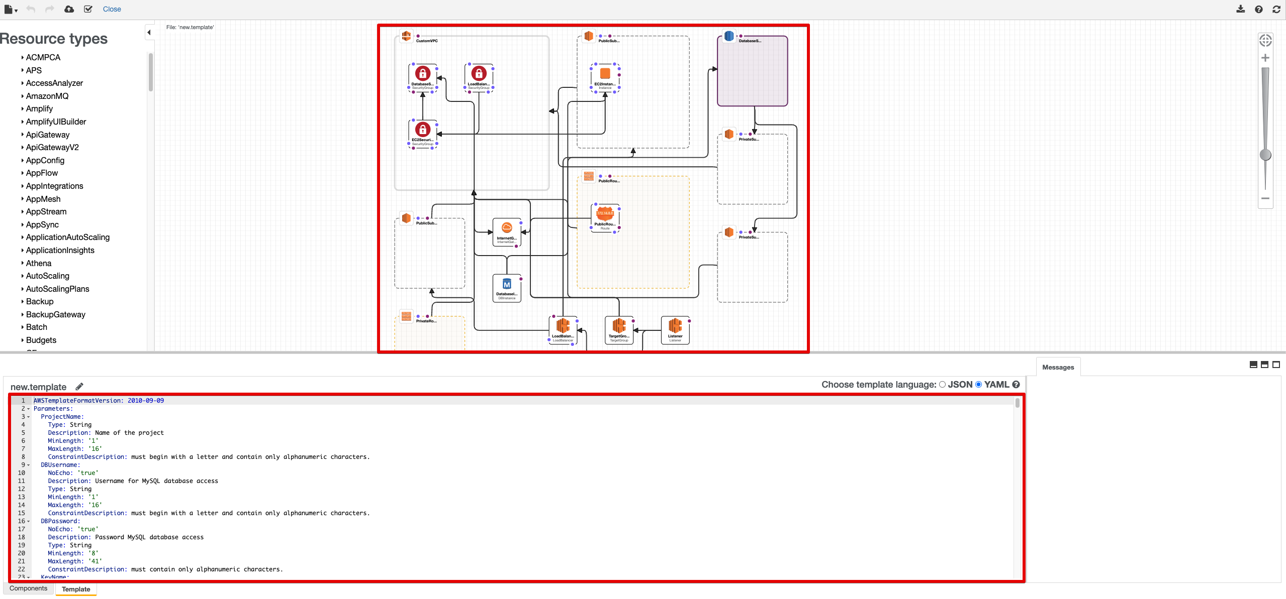 버튼을 클릭하면 구축하고자 하는 AWS 인프라 환경을 시각적으로 확인할 수 있는 페이지에 도달합니다. 페이지 왼쪽 하단의 Template 버튼을 클릭하면 json 또는 yaml을 사용해서 인프라를 코드로 정의할 수 있습니다.