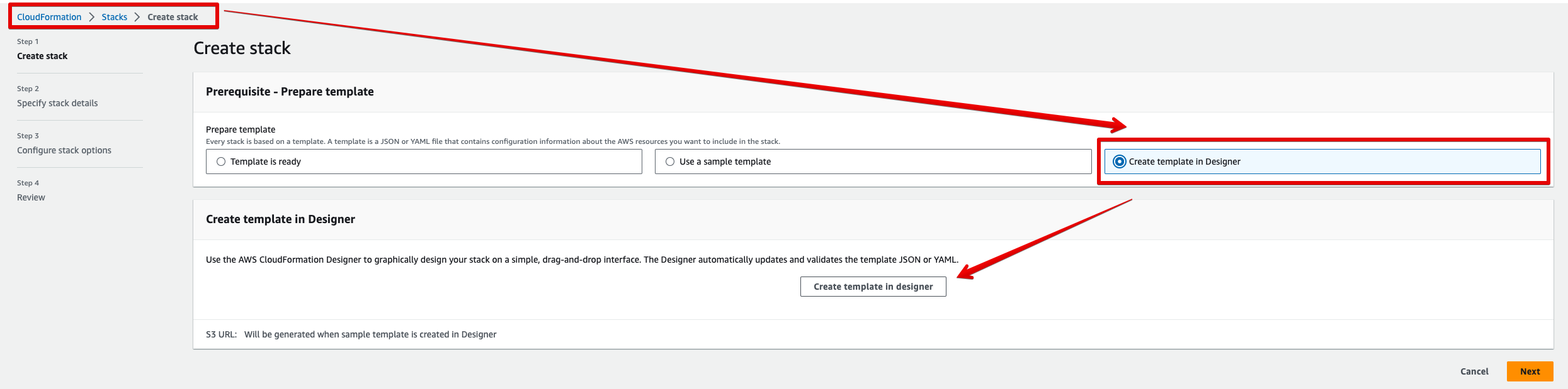 CloudFormation > Stacks > Create stack > Create stack