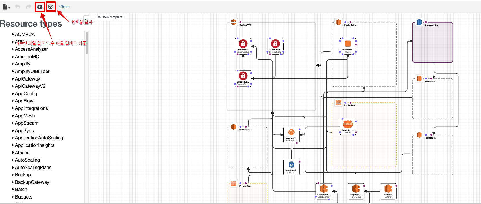 여기서 해당. yaml파일에 정의된 인프라의 유효성을 체크하고 그다음 단계인 실제 인프라 구축 단계로 넘어가 보겠습니다. 아래 화면에서 유효성 검사 버튼을 클릭 후 파일 업로드 버튼을 누르면 다음 단계로 이동할 수 있습니다.