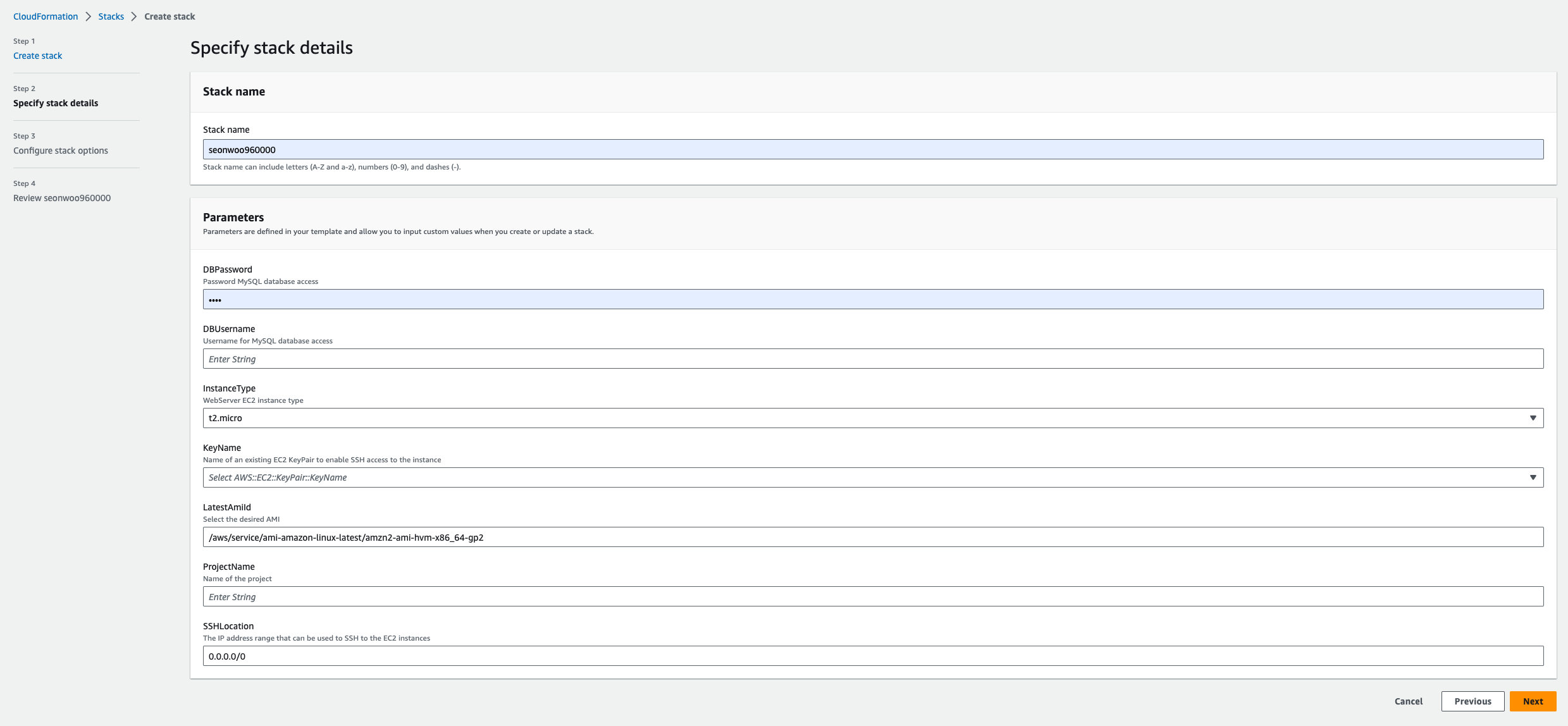 CloudFormation > Stacks > Create stack > Specify stack details