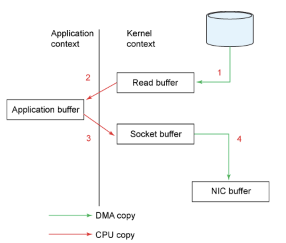 - 운영체제가 디스크상의 파일을 읽어 데이터를 커널 공간(kernel space)의 읽기 버퍼(read buffer)에 저장합니다.