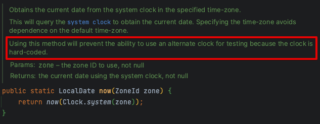 문제는 해결됐지만 한 가지 의문이 남았습니다. 로컬 개발환경과 배포환경에서의 시스템 시간이 다를 때 어떻게 테스트를 수행해야 하는지 궁금해졌습니다. 그래서 LocalDate에 대해 더 분석한 결과 LocalDate의 javadoc에서 그 실마리를 찾을 수 있었습니다. Javadoc에서는 LocalDate.now()와 LocalDate.now(ZoneId zone)를 사용하면 테스트 시 문제가 발생할 수 있음을 경고하고 있었습니다.