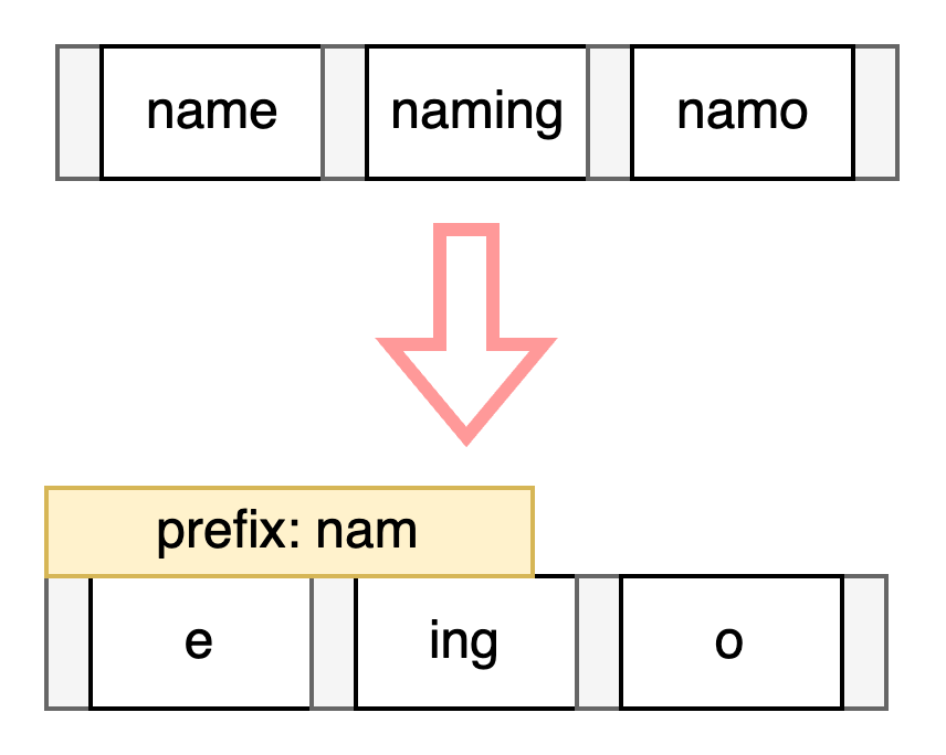 동일한 prefix를 가진 키 값은 prefix를 한 번만 저장함으로써 최적화하는 방법입니다.