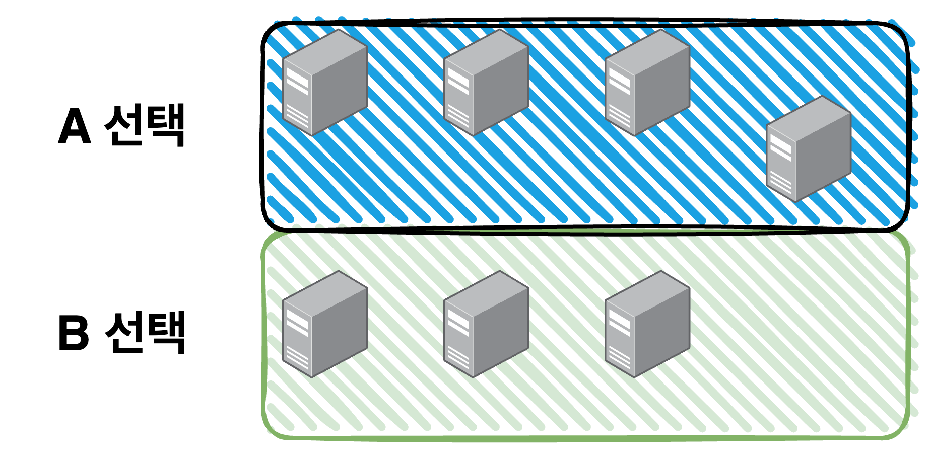 또한, Majority가 A를 선택하는 과정에 있는 경우와 동시에 또 다른 Majority가 C를 선택하는 과정에 있는 경우도 있을 수 있습니다. 이 경우에는 A를 선택한 Majority와 C를 선택한 Majority에 모두 포함된 노드를 통해 최종 합의 값을 결정할 수 있습니다. 아래 그림에서는 중간에 위치한 노드가 A를 선택한 Majority와 C를 선택한 Majority 모두에 포함되는 것을 확인할 수 있습니다.