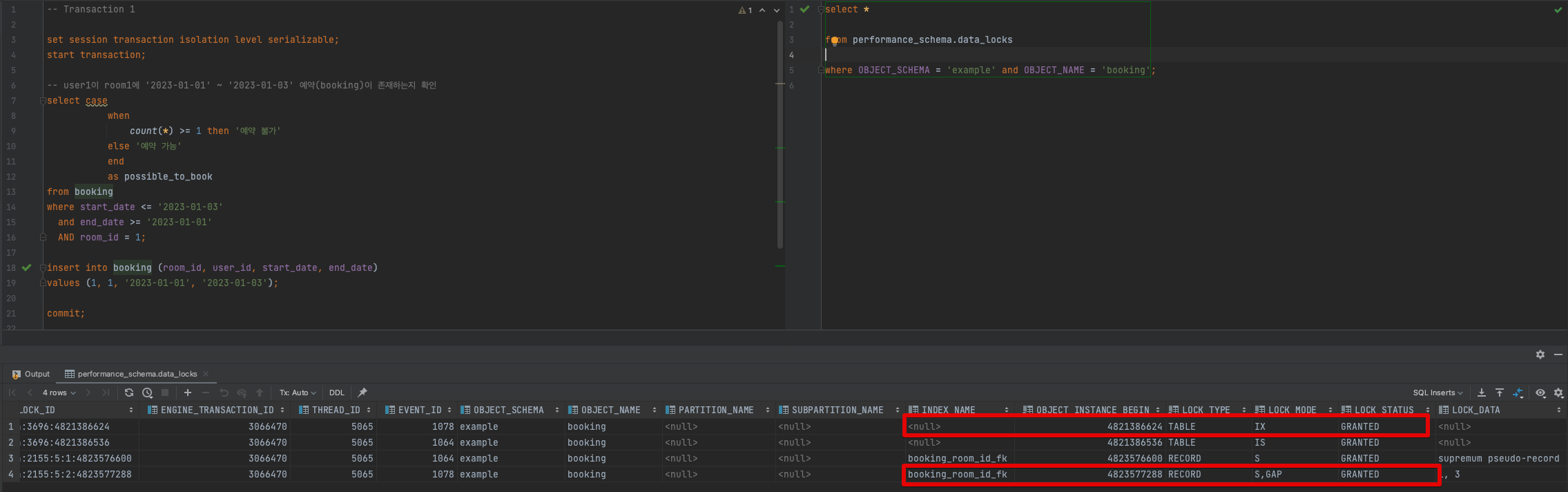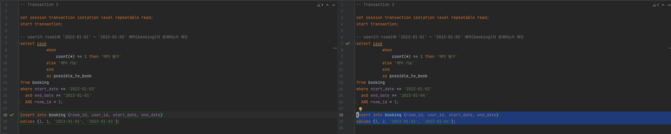 두 번째 트랜잭션에서는 "2023-01-02 ~ 2023-01-04" 사이에 1번 room의 예약 가능 여부를 확인하는 쿼리를 수행합니다. 결과적으로 두 쿼리 모두 1번 room이 트랜잭션에서 명시한 기간에 예약이 가능한 것으로 결과를 반환합니다.